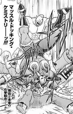 先日のロビンマスクとモンゴルマンの台詞は『キン肉マン』で初めて「マッスル・ドッキング」が披露された時の台詞であるわけですが、実は今週月曜日に上下逆の「マッスル・ドッキング・ケミストリー」が新たに披露されました。